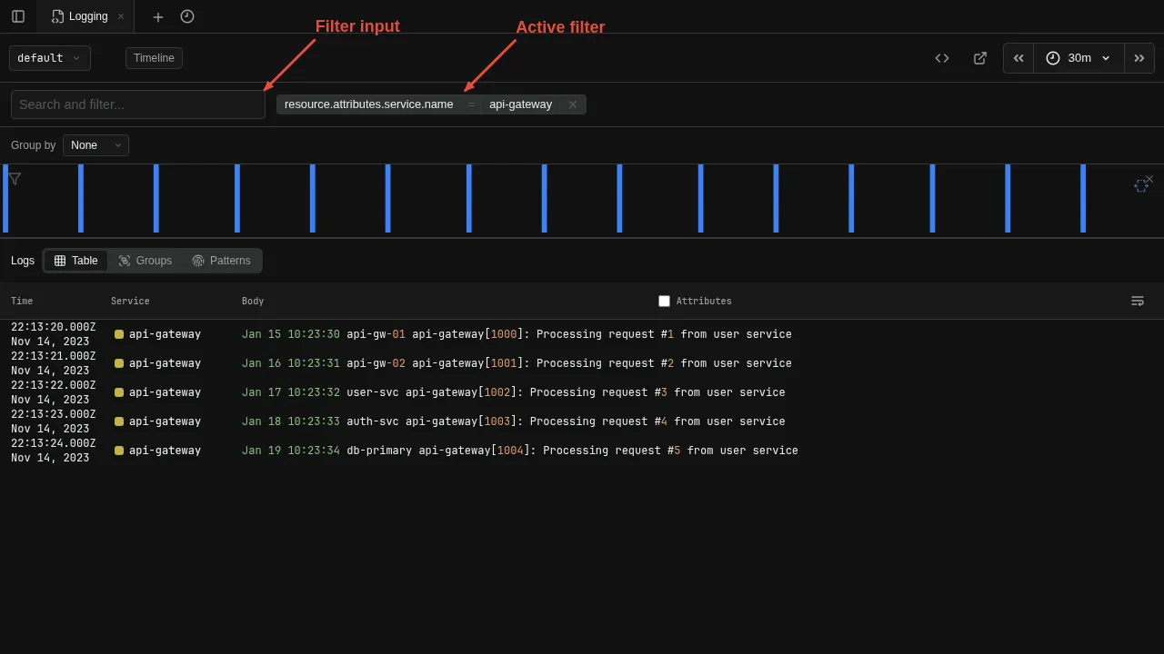 Build filters visually using the filter bar. Each filter appears as a chip showing the field, operator, and value. Click the filter input to open a three-step popover that walks you through building a filter. The field names and values shown in the popover are gathered from the current data using the otel-log-stats operator.
